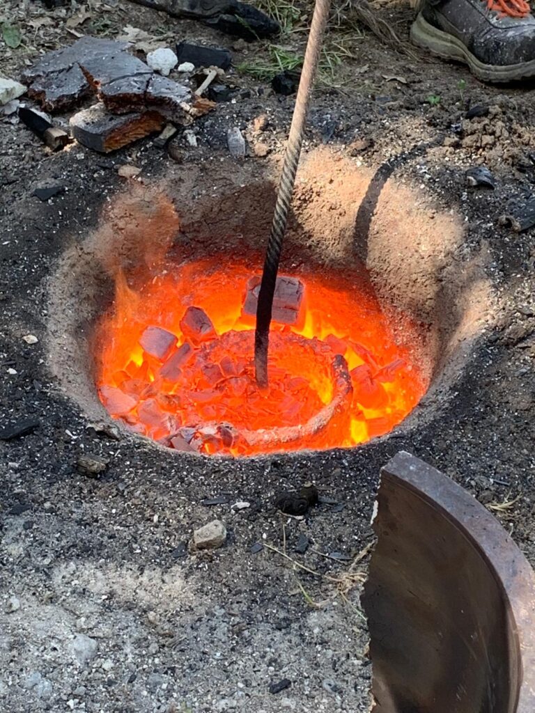 • Le bronze est porté à sa température de fusion (1200°C) dans un four creusé à même le sol. La chaleur est fournie par un feu de charbon activé par un ventilateur fabriqué localement. Le bronze en fusion est alors coulé dans le moule.